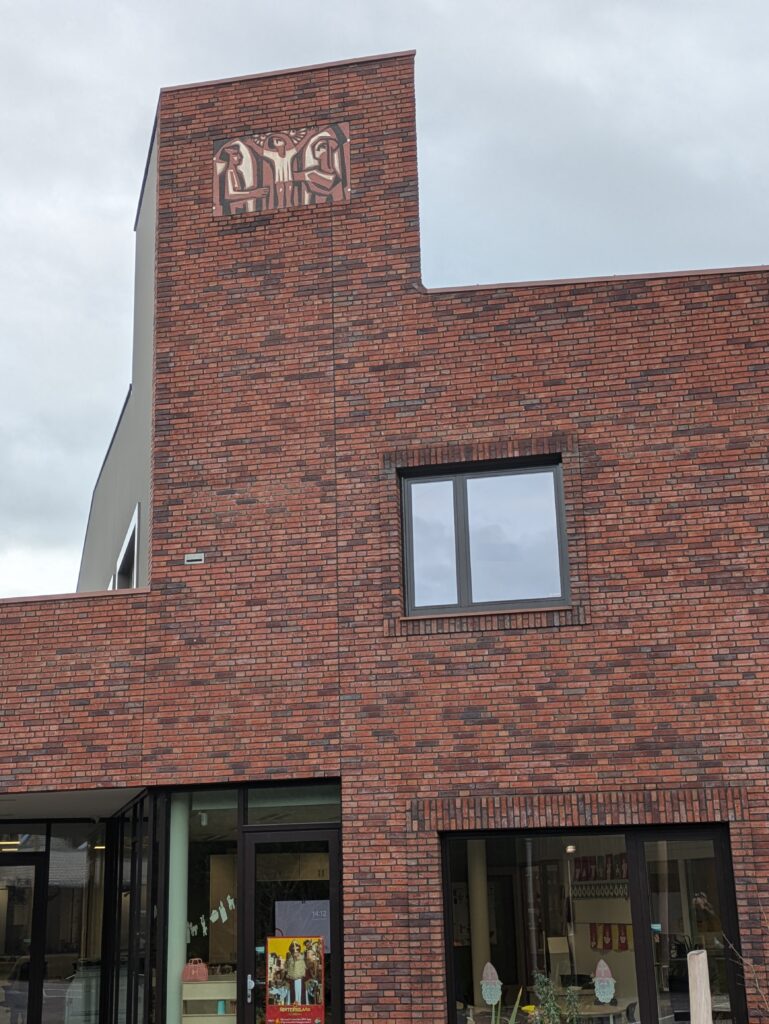 De in de gevel opgenomen bruine plaquette, gemaakt in 2008, sierde ook het oude gebouw. Het kleine mozaïek van groep 8 uit 2002-2003 en de Eerste Steen uit 1956 waren ook te bewonderen aan de buitenkant van het oude gebouw, maar worden nu nog binnen in het nieuwe gebouw aangebracht. De makers van de Eerste Steen en de bruine plaquette zijn onbekend.