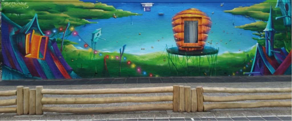 De kunstenaar is bekend om zijn grote muurschilderingen zoals de boekenkast op de Amsterdamsestraatweg in Utrecht. De Bijenkorf gaf hem de opdracht voor deze fantasierijke schildering op een muur aan het schoolplein. De bijenkorf, symbool voor de school, is prominent aanwezig. De muur is bedoeld als een klimmuur, binnenkort worden de grepen erop gemonteerd.